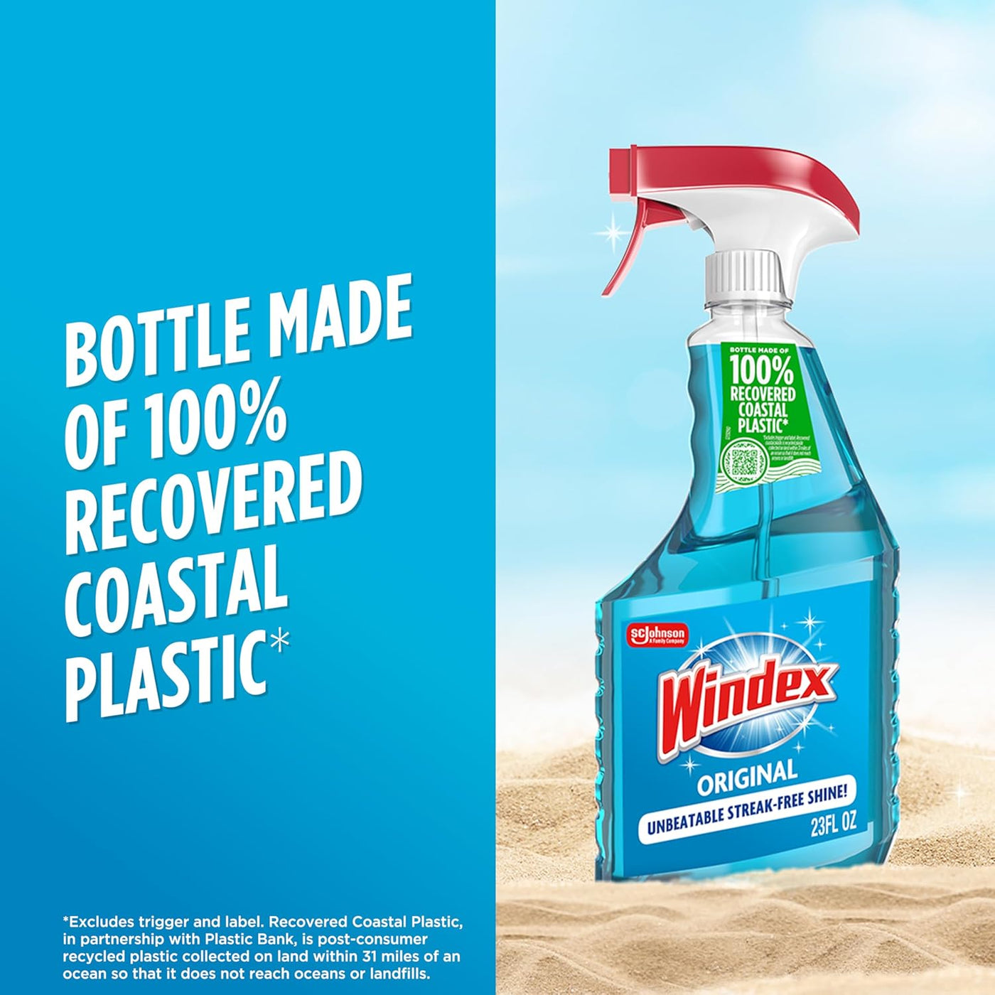 • Windex Commitment: spray bottles made from 100% recovered coastal plastic in partnership with Plastic Bank, is post-consumer recycled plastic collected on land within 31 miles of an ocean so that it does not reach oceans or landfills.
